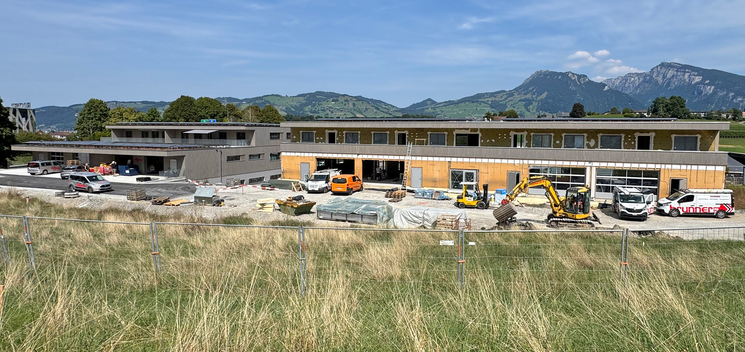Die Baumaschinen für den neuen Gewerbepark im Spiezwiler sind am Werk. In zwei Etappen entstehen vier dreistöckige Gewerbebauten mit Holzfassaden, welche sich harmonisch in die umliegende Landschaft integrieren.